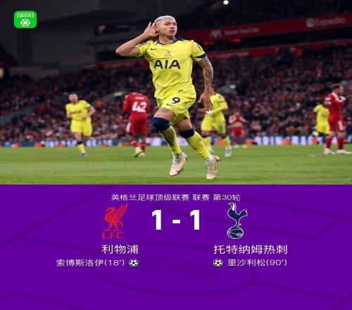 剑南春利物浦11热刺,索博斯洛伊任意球破门,里沙利松绝平